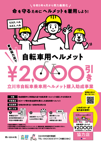 令和5年4月1日より道路交通法の改正により、自転車用ヘルメットの着用が努力義務化されました。立川市では、自転車乗車用ヘルメット購入助成が2023年…...