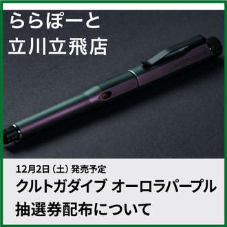 12月2日(土)販売予定クルトガダイブオーロラパープルをお求めのお客様を対象に、下記日時にて抽選券を配布いたします。この抽選券は、配布期間中に会場…...