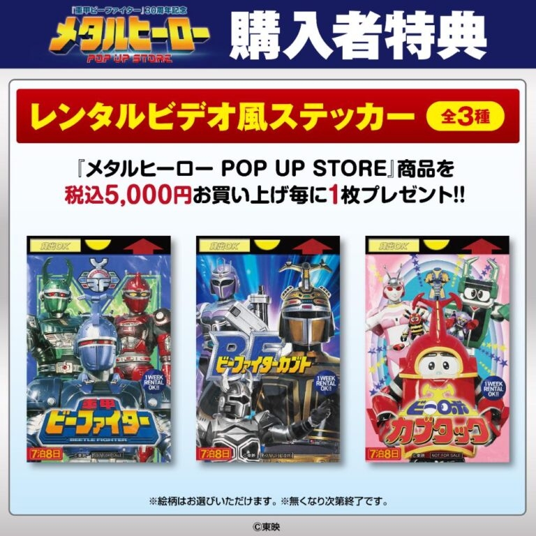 購入者特典「レンタルビデオ風ステッカー」をプレゼント! ※イベント開催期間中「メタルヒーローシリーズ関連商品(一部除く)」のご購入5,000円(税込)毎に1枚、「レンタルビデオ風ステッカー」をプレゼント。(無くなり次第終了) ※特典の交換はできませんのでご了承ください。