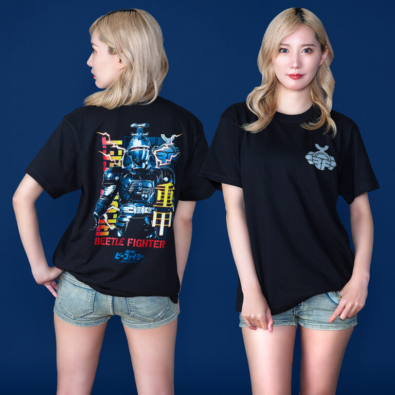 ブルービート Tシャツ/5,500円(税込) サイズ:M〜XXL メタルヒーローシリーズの人気作『重甲ビーファイター』のオリジナルTシャツをリリース!その着心地、まさにインセクトアーマー!思わず「重甲!」と叫びながら着たくなる、重厚感あふれるハイクオリティなTシャツ!背面のブルービートは脅威の極厚シルクスクリーン仕様!