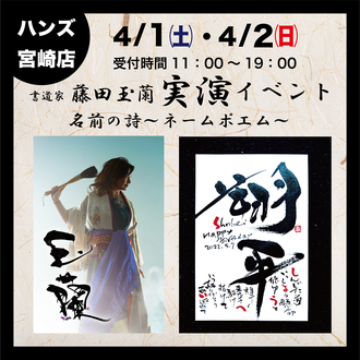 皆さん、こんにちは!いつもハンズ宮崎店のブログをご覧いただきましてありがとうございます。来たる、4/1(土)・4/2(日)、人気書道家・藤田玉蘭先…...