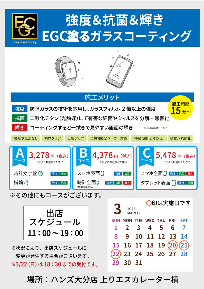 店舗のイチオシ 【大分店】3月ガラスコーティング実施日程 3月のガラスコーティングの日程をお知らせいたします。 3月は、3月20日(金)・21日(土)・22日(日)の3日間 の予定です。 時間は11:00~18:30。 ※最終日の3月22日(日)は18:30までになります。 場所は店内モバイルコーナーにて実施いたします。 ハンズ大分店へご来店の際は、ぜひお立ち寄りくださいませ♪ 2026年2月28日 09:00 前の記事 次の記事