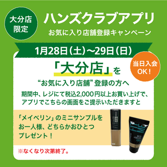 1月28日(土)・29日(日)の2日間限定!レジにて税込2,000円以上お買い上げの方、且つ、ハンズクラブアプリにて、「大分店」をお気に入り店舗登…...