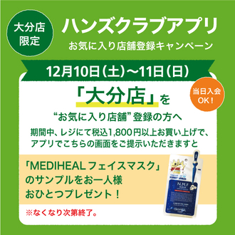 !予告!12月10日(土)・11日(日)の2日間、レジにて税込1,800円以上お買い上げの方、且つ、ハンズクラブアプリにて、「大分店」をお気に入り…...