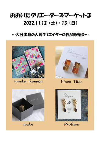 11月12日(土)、13日(日)の2日間、『おおいたクリエーターズマーケット3』を開催します。4人の大分ご出身の人気作家さんが今回のイベントのため…...