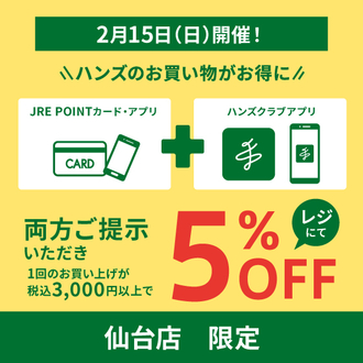 2月15日(日)はハンズ仙台店限定、JREカード(またはアプリ)とハンズクラブアプリの両方をご提示で5%OFF!(一回のお買い上げ金額が税込3,0…...
