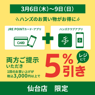 3月14(金)~16日(日)はハンズ仙台店限定、JREカード(またはアプリ)とハンズクラブアプリの両方をご提示で5%引きさせていただきます!(一回…...