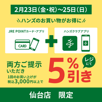 お待たせしました、今月お待ちかねの15日!2024年2回目の5%オフです。ハンズ仙台店限定、毎月15日はJREとハンズクラブアプリの両方をご提示で…...