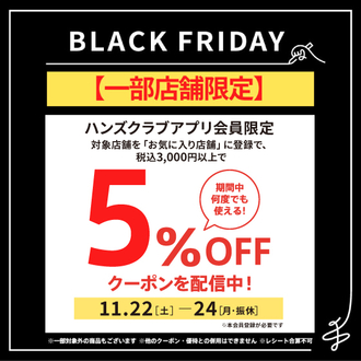 ブラックフライデーはハンズクラブアプリでさらにおトク!アプリ本会員限定!対象店舗を1店舗以上「お気に入り店舗」登録されているお客様に、対象店舗で税…...