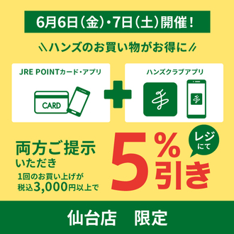 6月1日(日)はハンズ仙台店限定、JREカード(またはアプリ)とハンズクラブアプリの両方をご提示で5%引きさせていただきます!(一回のお買い上げ金…...